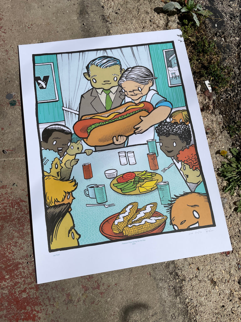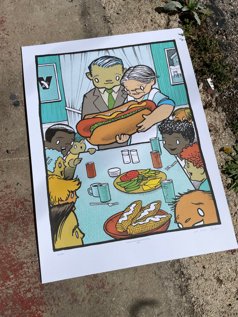 18 by 24 inches. Heavy white paper stock. Fancy archival digital print, not a screenprint, commissioned by Chicago’s VIENNA BEEF in 2023 for a sausage-themed print series. Image is obviously a tribute to Norman Rockwell’s “Freedom From Want”(1943). Signed and numbered “Subscriber” edition of 50. 150 prints made, overall.